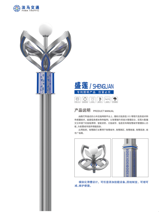 4、專(zhuān)業(yè)設(shè)計(jì)人員、豐富的設(shè)計(jì)經(jīng)驗(yàn)。法馬智慧多功能桿風(fēng)格多樣,造型美觀大氣,目前擁有雙子星款、滑翔款、玉堂春款、墨樓款、重邁款、諜影款、桃花源款等多種款式,且擁有外觀專(zhuān)利。