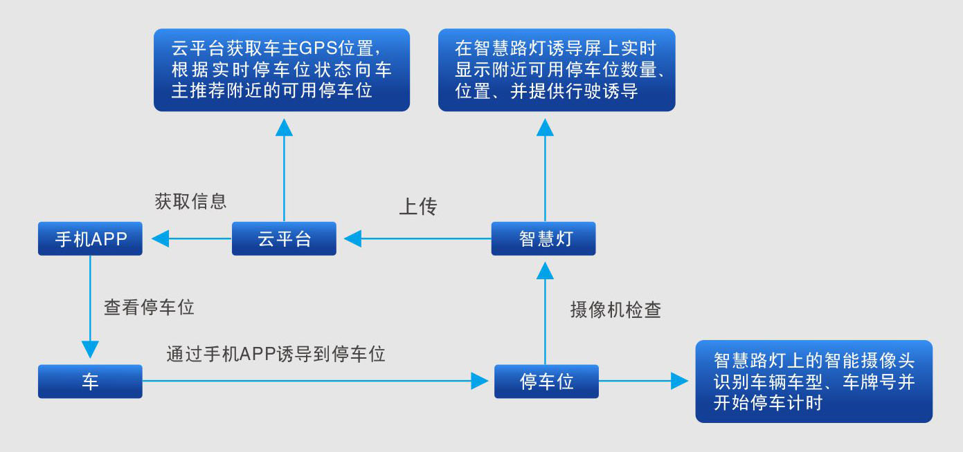 通過路燈桿上的傳感器,檢測(cè)車輛信息和停車位信息,有序安全管理停車