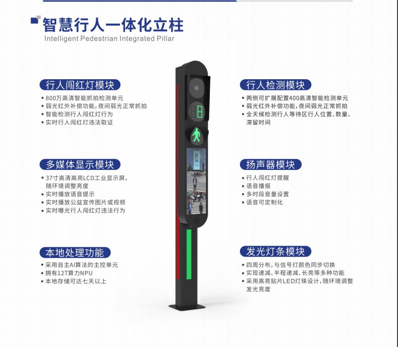 智慧行人過街管控提升方案,通過在斑馬線設(shè)置行人闖紅燈抓拍功能、語(yǔ)音播報(bào)提醒、LCD屏曝光等手段,對(duì)行人闖紅燈進(jìn)行治理工作,解決行人闖紅燈問題,以及沒有對(duì)盲人過街進(jìn)行有效指示問題,減少斑馬線事故