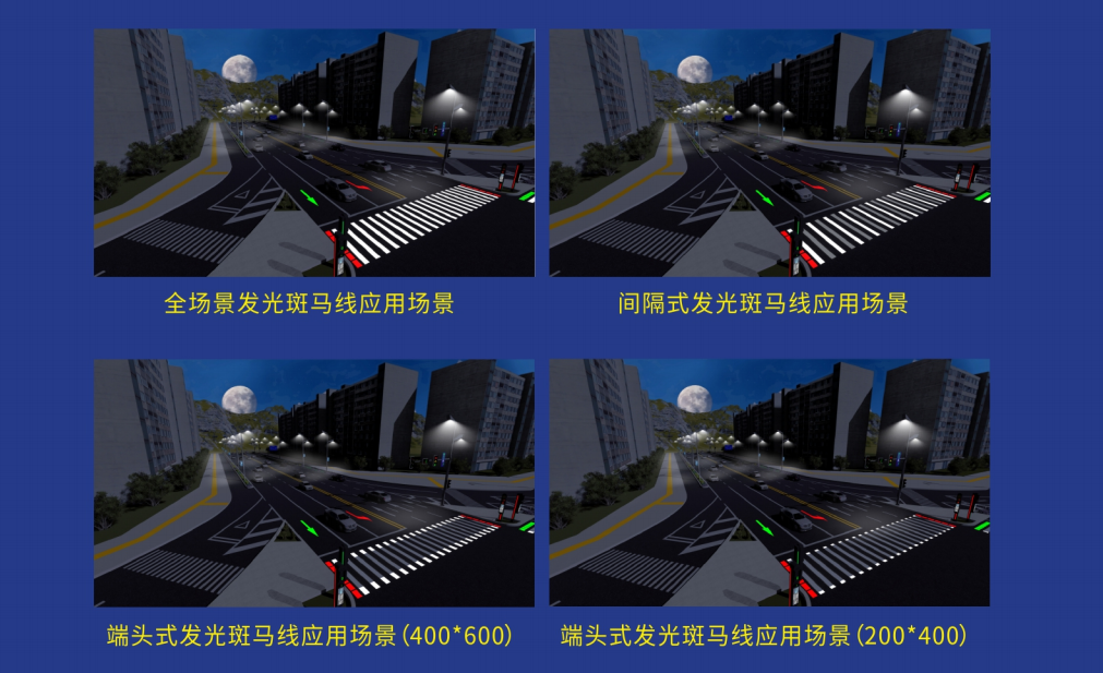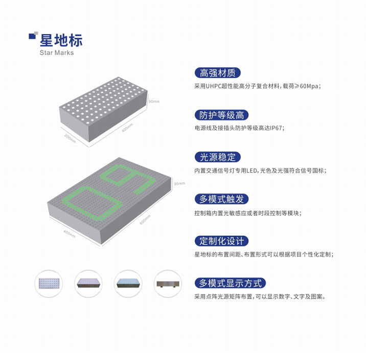 不僅在信號(hào)燈、語(yǔ)音以及圖像對(duì)行人進(jìn)行提醒和警示,同時(shí)方案中的星地標(biāo)采用點(diǎn)陣燈珠排布,可同步顯示行人倒計(jì)時(shí)或顯示文明標(biāo)語(yǔ),在亮化了斑馬線為駕駛員提供好的視線的同時(shí),又有效地為低頭族等行為人員給予提醒與警示