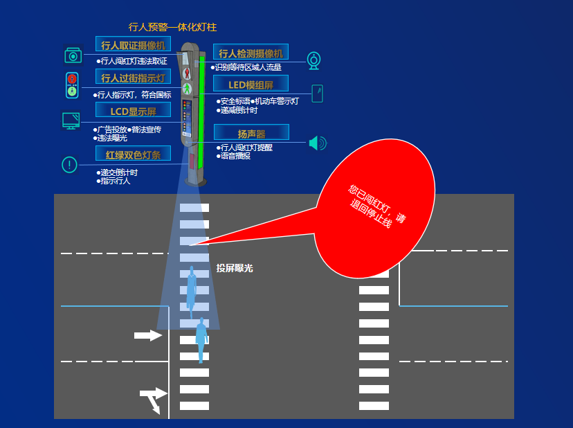 紅綠燈檢測器感知紅綠燈狀態(tài)、檢測相機(jī)抓拍行人闖紅燈行為、曝光屏曝光、語音喊話